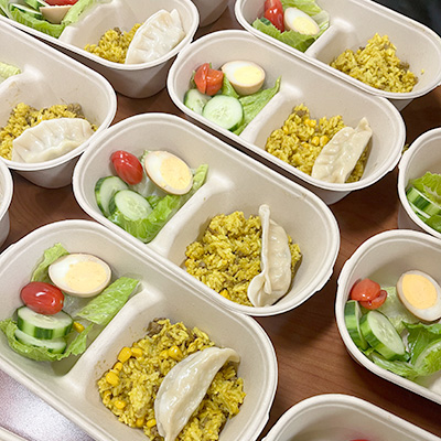 ▲ 毎年、秋にはおにぎりの写真を撮って世界中の子どもたちに給食を届ける社会貢献活動「おにぎりアクション」に参加しています。