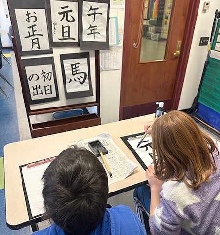 アーティストとしてアーティスト・イン・レジデンスのプログラムで指導した経験を生かし、子どもたちの好奇心を引き出す創造的な日本語教育を行います。毎月、さまざまな技法を取り入れながらオリジナルの「日本語カレンダー」を作成する活動は、子どもたちに大人気。キンダーガーテンのクラスを訪れ、一緒に日本語を練習する5年生も「理子先生に会えるのが楽しみ」と話します。