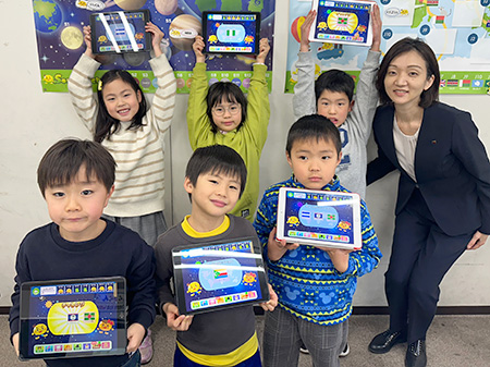 ▲ 教室ではタブレットを使い、計算ゲームに取り組みます。全員でミッションクリアを目指す「暗算リレー」で楽しくレベルアップ。