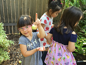 ▲ 春には学級園で野菜作り。収穫した野菜を使ってみんなで作る焼きそばは格別なおいしさです。学びと体験がつながります。